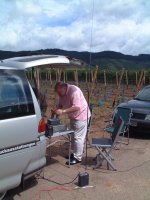 Diese Begebenheit sollte einmal näher untersucht werden und somit fuhr man gut ausgerüstet in der ersten Juli-Woche des Jahres 2007 an die Mittelmosel. In dem kleinen Weinort Kröv war schnell ein passender Weinberg ausgemacht und wir konnten mit dem Aufbau beginnen. Zuvor mussten aber noch Winzer, die an angrenzenden Rebstöcken ihrer Arbeit nachgingen, über unser Handeln aufgeklärt werden. Schon bei der Anfahrt von drei PKW schauten sie misstrauisch zu uns rüber, was sich beim "Aufbau der Gerätschaften" noch verstärkte ... Dieter (DK5PZ) beseitigte in seiner gewohnt routinierten Art und Weise jedoch schnell alle Zweifel bei den erstaunten Weinbauern. Trotzdem stellten wir nach kurzer Zeit einen erhöhten "Tourismus" in dem ansonst recht abgelegenen Gebiet fest - die Aktion schien sich rasch "rund gesprochen" zu haben ...