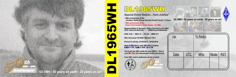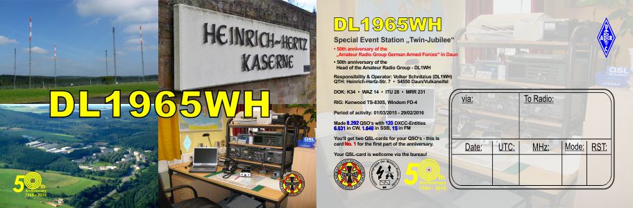Am 29. Februar 2016 ging die Sonderstation „DL1965WH“ nach einem Jahr reger Betriebsamkeit auf den Amateurfunkbändern QRT. Die Jubiläumsstation der Amateurfunkgruppe der Bundeswehr am Standort Daun (AfuGrpBW StO Daun) stellte nach 366 Tagen am späten Abend den Funkbetrieb ein. Vor genau einem Jahr, am 01.03.2015 um 11:18 UTC, trug sich OM Eric Bettles (G3KXE) aus Southampton mit seinem QSO auf 7.082 MHz in SSB als erster in das Logbuch der Sonderstation ein; geschlossen wurde es nach einer letzten Funkverbindung mit OM Ignacy Karolczyk (SP9QJ) aus Katowice um 20:48 UTC auf 3.519 MHz in CW. Rückblickend gab es viele schöne Momente während des Funkbetriebes. Glückwünsche aus aller Welt ereilten die Station via Funk, aber auch über den elektronischen- sowie althergebrachten Postweg. Gearbeitet wurde auf Kurzwelle ausschließlich in CW (knapp 80%) und SSB (knapp 20%), der Rest waren einige wenige FM-Kontakte auf dem 2m- und 70cm-Band über örtliche Repeater. Gerade am Anfang waren Pile-up’s in Telegrafie die Regel, geradezu extrem auf dem 40m-Band von europäischen Stationen. Aber auch japanische Stationen hielten diesen neuen Prefix wohl für sehr ansprechend - ihnen gelang häufig gleich reihenweise auf den höheren Bändern der Einzug ins Logbuch. Manche Funkamateure wollten dieses ungewöhnliche Rufzeichen auf allen Bändern in ihrem Log haben - einigen von ihnen gelang zumindest ein 7-Band-QSO. Das 160m-Band wurde mangels geeigneter Antenne nicht genutzt, auf dem 10m-Band kamen nur wenige Stationen ins Logbuch.