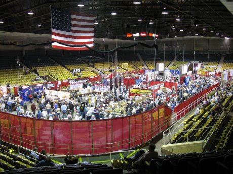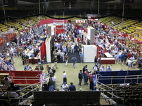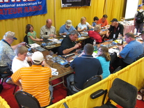 Der Tag begann, wie die anderen Tage zuvor auch, um 07:15 Uhr beim Treffpunkt im Gang vor den Zimmern und dem anschließenden Weg zum Frühstücksraum quer durch die Hotelanlage. Wir ließen uns das opulente Frühstück schmecken, um gestärkt den letzten Tag Hamvention zu begehen. Um kurz nach 09:00 Uhr waren wir am Messegelände, dass sich an diesem Morgen deutlich "ausgedünnt" präsentierte. Viele Besucher waren am Abend zuvor schon abgereist. Aber auch viele Aussteller, besonders auf dem Flohmarkt-Freigelände, waren schon verschwunden. An diesem Morgen kam man noch unbeschwerter durch die Gänge und Flure der Hallen, die Besucherzahl war deutlich geringer als an den Tagen zuvor. Vergleichbar mit der HAM Radio in Friedrichshafen schien es auch hier so zu sein, dass der letzte von drei Ausstellungstagen gleichzeitig auch der mit der geringsten Besucherzahl ist. Ich drehte noch eine "schnelle Runde" durch alle Hallen - man weiß ja nie, ob man in den Tagen zuvor nicht etwas übersehen hat … unter anderem kam ich auch am Stand der "QCWA" (Quarter Century Wireless Association) vorbei. Dort kann jeder Funkamateur Mitglied werden, der mindestens 25 Jahre im Besitz einer Amateurfunklizenz ist. Gleich wurde ich herzlich begrüßt und man fragte mich, ob ich Mitglied sei … hatten sich die Strapazen der letzten Tage bei mir so ins Gesicht "gebrannt" und mich um einige Jahre altern lassen??? Aber immerhin - war ich doch wenige Tage zuvor genau 20 Jahre im Besitz meines Amateurfunkzeugnisses … der Erwerb der Vibroplex meinerseits lies Dieter keine Ruhe und so "legte er an diesem Morgen nach" - bei Tony Baleno (N3ZN Keys, LLC) kaufte er eine wunderschöne Morsetaste und auf dem Rückweg noch einige andere Kleinigkeiten wie eine recht große amerikanische Flagge, die in der Qualität bei weitem das schlug, was wir bis jetzt an Angeboten dieser Art in Europa gesehen hatten. Tolles Tuch, gestickt und in schwerer Ausführung, wird sie wohl fortan in Deutschland bei der ein- oder anderen Gelegenheit ihren Dienst verrichten. Jetzt ging alles recht schnell: die Zeit verstrich und das Ende der Messe rückte unaufhaltsam näher! Um 12:00 Uhr war es dann soweit - aus den Lautsprechern ertönten Dankesreden an die Besucher und die ersten großen Aussteller begannen mit dem Abbau. In einer Ecke der Arena versammelten sich immer mehr Menschen, die Ränge des Eisstadions füllten sich zusehends … es stand die traditionelle Tombola an. Die Moderatoren stimmten die Massen auf das bevorstehende Ereignis ein und bedankten sich schon einmal bei allen Sponsoren für die großartigen Preise … nachdem einige Minuten vergangen waren, begann das Spektakel mit der Ziehung der ersten Lose. Diese waren Abschnitte der Eintrittskarten, die die Besucher im Laufe der Messe den freundlichen Helfern übergaben, die hinter einer Absperrung standen und sie in die riesige, auf einem Spezialgestell montierte und mittels Motor angetriebene Lostrommel warfen. So hatte jeder Besucher die Chance auf die Top-Ten der Preise, denn auch wer nicht am letzten Tag unmittelbar bei der Verlosung anwesend sein konnte, wurde im Anschluss benachrichtigt und ihm der Preis zukommen gelassen. Alle anderen Preise mussten unmittelbar in Empfang genommen werden d.h. der Losinhaber musste noch vor Ort - sprich in der Halle sein. Somit kam es z. T. zu mehrfachen Aufrufen, bis ein Preis den Besitzer wechselte … viele Nummern wurden verkündet und hin- und wieder ertönte von den Rängen ein "Here I am!" oder "Yeepe!". Da sich dieser Vorgang aber lange hinauszögerte und es absehbar war, dass die ersten 10 Preise so erst in ein paar Stunden zur Verlosung kommen würden, brachen wir hier ab und begannen, den Stand des Callbook-Verlages mit abzubauen. Das war's dann: um 13:00 Uhr verließen wir das Messegelände und meine erste Hamvention war vorüber …