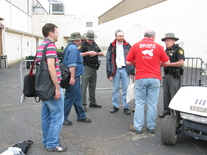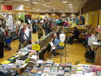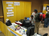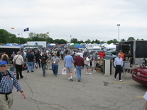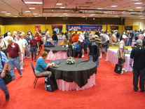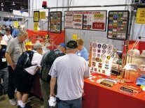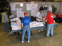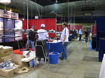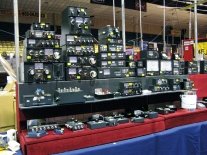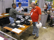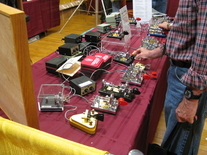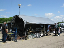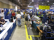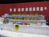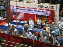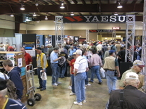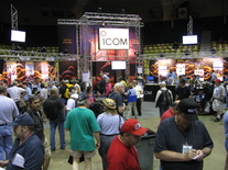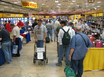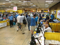 Gegen 06:00 Uhr wurde ich wach - ich hatte geschlafen wie ein "Toter"! Man war das eine gute Nacht! Zuhause schaffe ich das so nie … nachdem ich die neusten Infos aus dem amerikanischen Fernsehen konsumiert hatte, ging's unter die Dusche, denn heute wollten wir eher frühstücken: 07:15 Uhr war ausgemacht, alle waren pünktlich. Die "Zeremonie" zeigte starke Parallelen zum vergangenen Tag … reichhaltiges amerikanisches Breakfast mit allem Drum und Dran! Im Anschluss brachen wir rechtzeitig auf, um kurz vor 09:00 Uhr die Hara Arena zu erreichen, denn der Messebeginn ist auch in den USA pünktlich! Wir benutzten als "Aussteller" jeden Morgen und Abend einen Seiteneingang, von dem aus wir recht schnell zum Ausstellungsstand 46/47 in der Arena und zurück zum Parkplatz gelangen konnten. Thomas und Edgar orientierten sich direkt zu ihrem Stand, an dem sich auch Stephan einfand. Harald verschwand recht schnell auf den Weiten des Messegeländes. Ich machte mich auch direkt auf den Weg ins Wirrwarr, die Gänge und Hallen waren für diese frühe Zeit schon gut besucht. Und jetzt wurde es mir auch bewusst: ich bin auf der Hamvention! Ein Traum wird Wirklichkeit - a dream comes true! Jetzt erst einmal die Orientierung erlangen … die deutschen Messen und Ausstellungshallen kannte ich ja schon zu Genüge, aber hier ist ja alles viel, viel größer! Ich hatte vom Vortag so ungefähr den "Lageplan im Kopf" - Hilfestellungen waren die unterschiedlichen farblichen Kennzeichnungen der seitlichen, inneren und äußeren Stoffabtrennungen in den Hallen: rot, blau, gelb und grau. Das half, um sich grob zu orientieren. Insgesamt machten die Gebäude und Hallen einen ziemlich heruntergekommenen Eindruck auf mich. Seit der Zeit ihrer Fertigstellung ist da wohl baulich nicht mehr viel passiert … lustig war die "gelbe" Halle, der "Ballroom", an dessen Decke alle paar Meter Kronleuchter hingen, die den schnöden Charme der 60er-Jahre verströmten. Hier waren seinerzeit wohl größere Tanzveranstaltungen … aber das sind Äußerlichkeiten, und wegen denen kamen wir ja hier nicht hin. Als Erstes ging ich aufs Flohmarktgelände, das ist bei mir immer der erste Weg auf einer Messe. An diesem Morgen war der Himmel noch sehr bedeckt, aber trotzdem war schon recht guter Betrieb zu verzeichnen. Hier hielt ich mich den ganzen Vormittag auf … ließ mich treiben, ging die Gänge hoch und runter, schaute mir viel an und musste hier und da staunen: was macht eigentlich ein F-16 Flugsimulator für $ 2.500 hier? Na gut, Elektronik … aber ein fahrbarer Obduktionstisch mit Leichencontainer (Cadaver Storage Tank) für $ 500 ??? Naja … auch ein 5-KW AM-Sender, umgerüstet für Amateurfunkbetrieb, ließ aufmerken.