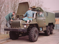 Im Jahre 1992 stellte man innerhalb der Amateurfunk- gruppe der Bundeswehr am Standort Daun (AfuGrpBWStO Daun) Überlegungen hinsichtlich eines „mobilen Gefechtsstandes“ (sprich eines Funkfahrzeuges) an. Da wir hier in der Nähe - auf dem Eselsberg bei Dockweiler - ein Contestgelände mit Kurbelmast sowie montierten VHF-/UHF-Antennen betreiben, und Funkbetrieb bei zum Teil widrigsten Wetterbedingungen im Zelt oder auf der Ladefläche eines zivilen 7,5t LKW durchführen mussten, lag der Gedanke nahe, einmal ein richtig trockenes und von starker Zugluft geschütztes Funk-Shack zu haben. Doch woher nehmen? Ein festes Gebäude errichten? Einen Container hinstellen? Nein, das geht nicht … der Mast steht in geduldeter Art und Weise auf einem fremden Grundstück (und musste im Laufe seiner Geschichte schon mehrfach versetzt werden), dafür gäbe es keinerlei Genehmigungen, ganz zu schweigen von den Kosten. Also bliebe nur eine mobile Unterkunft - vielleicht ein Wohnwagen, Campmobile oder ähnliches … oder: ein militärischer LKW! Zu dieser Zeit hatte man über dienstliche Wege Kenntnis darüber erlangt, dass an der Technischen Schule des Heeres (TSH) in Aachen ein russischer LKW Typ URAL-4320 ausgesondert werden sollte. Dieser hatte einen Funkkoffer als Aufsatz - ideal - dachte man zumindest zu dem Zeitpunkt …! Das Fahrzeug war neuwertig, stand zur „Wendezeit“ in einem DDR-Depot („Minister-Reservelager“) und war nach den damaligen Bestimmungen für den DDR-Straßenverkehr umgerüstet worden. Die Ereignisse und Folgen des Mauerfalls „überrollten“ den Lauf der (geplanten) Dinge, und somit konnte er seiner ursprünglichen Bestimmung nicht mehr zugeführt werden. Später kam der LKW dann zur TSH nach Aachen, um dort als Anschauungsobjekt für militärische Fahrzeugtechnik der Warschauer Pakt-Staaten (WP-Staaten) zu dienen. Doch auch hier endete diese Aufgabe recht schnell und es wurde wieder ein neuer Besitzer gesucht.