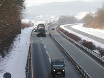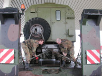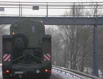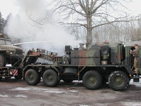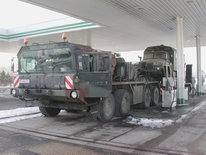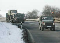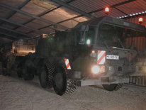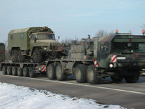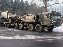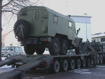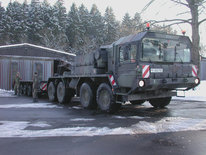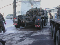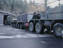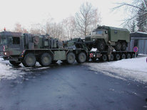 Und tatsächlich: gegen Nachmittag rollte der Schwertransport (SLT „Elefant“) des 6./TrspBtl 465 mit Begleitfahrzeug samt vier Soldaten in die Heinrich-Hertz-Kaserne ein! Nach Einweisung in die Lage vor Ort begannen die vier Mann sofort damit, den LKW aufzuladen. Routiniert und ohne Hektik verliefen alle Arbeitsschritte. Als erstes stellte das Zugfahrzeug mit mächtigen 732 PS seinen Anhänger in Front der Halle 45/III ab. Dann setzte das Zugfahrzeug rückwärts in die Halle vor den URAL, um den mittels zwei Stahltrossen von der bordeigenen Winde anzuhängen und vor die Halle zu ziehen. Nach fast 13 Jahren Standzeit setzte sich der URAL ohne Murren in Bewegung. Gott sei Dank sind die Bremsen bei diesen Systemen offen und müssen nicht, wie bei „West-LKW“ üblich, erst durch Laufenlassen des Motors und gleichzeitigem Betrieb des Kompressors, unter Druck gebracht und geöffnet werden. Anschließend wurde der Anhänger wieder angekuppelt und vor den URAL gesetzt, um ihn dann zu verladen. Dies geschah mitten in der Schichtwechselzeit zum Einsatzgebäude, was ein „kleines Verkehrschaos“ verursachte … somit kam der LKW noch einmal zu allen Ehren! Hans-Dieter Traxel (DK5PZ) dokumentierte alle Vorgänge mit digitaler Foto- sowie Video-Kamera und hatte so „alle Hände voll“ zu tun. Als der URAL fertig verladen und gesichert auf dem Anhänger stand, bot das Gespann schon ein imposantes Bild! Nach dem endgültigen Verzurren der Fracht wurde eine Höhenmessung durchgeführt - und die ergab nichts Gutes: 4,65m! Der Marschkredit sah aber nur eine Höhe von 4,20m vor … das erforderte einige Maßnahmen, die vor Ort bei eisiger Kälte gleich erledigt wurden. Zuerst wurde die Zusatzheizung für den Kofferaufbau samt Auspuffrohr oberhalb der Fahrerkabine demontiert - dies brachte schon ein ganzes Stück an Gewinn. Dennoch reichte es nicht, sodass nun noch Luft aus allen sechs Reifen abgelassen wurde, bis die vorgegebene Höhe erreicht wurde. In den späten Abendstunden und in Dunkelheit wurden die Arbeiten beendet. Am nächsten Morgen rollte der Konvoi dann letztmalig die Kasernenstrasse hinunter und durchfuhr gegen 08.50 Uhr das Kasernentor in Richtung Autobahn Koblenz. Dieter Traxel (DK5PZ) und René Weland (DL7WR) begleiteten den Tross noch einige Kilometer, um interessante Fotoaufnahmen zu machen. Bei Ochtendung endete dann die Begleitfahrt und beide kehrten mit imposanten Aufnahmen zurück. Der Konvoi fuhr dann durch die vier Bundesländer Rheinland-Pfalz, Hessen, Thüringen und Sachsen, wo er in der folgenden Nacht in Dresden beim Militärhistorischen Museum der Bundeswehr wohlbehalten ankam.
